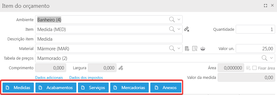 Acesso em: Vendas > Orçamentos > Aba de "Ambientes" > Item do orçamento > Abas destacadas em vermelho