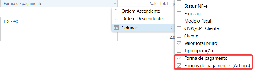Implementado nova coluna "Forma de pagamento". Retorno da primeira forma/condição de pagamento informada na nota fiscal de saída. Quando mais de uma forma/condição de pagamento, consta nas "Actions" (três pontos) na coluna.
