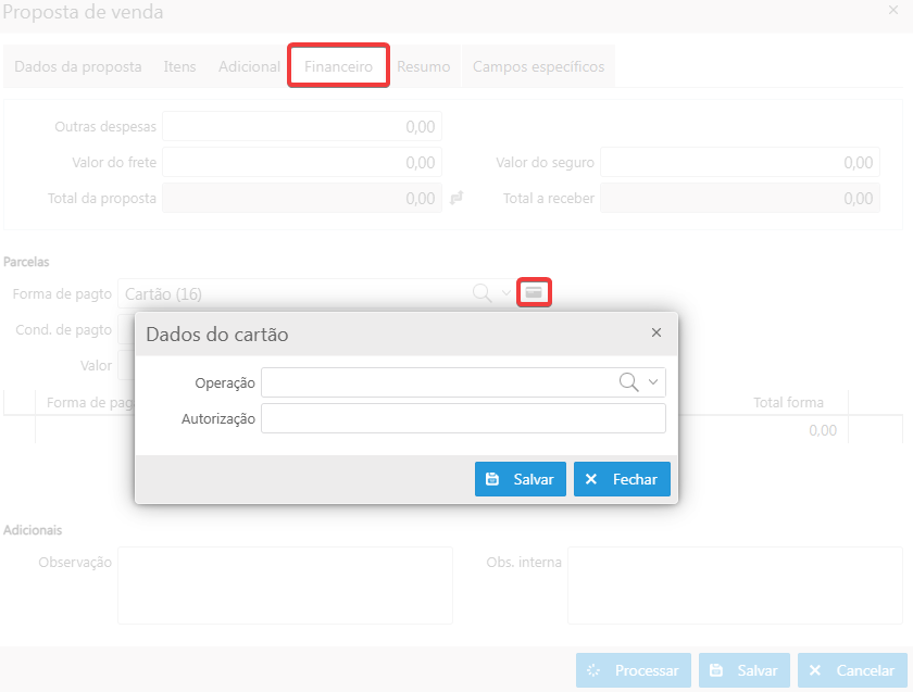 Caso os dados do cartão não sejam informados, será exibida a seguinte mensagem de alerta somente ao tentar processar NF-e (modelo 55) e NFC-e (modelo 65): "Operação de cartão deve ser informada para formas de pagamento do tipo cartão".