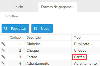 Foi criada uma nova listagem: Operações de cartão, onde devem ser cadastrados os dados do Fornecedor (credenciadora de cartão), Bandeira e Tipo.