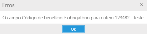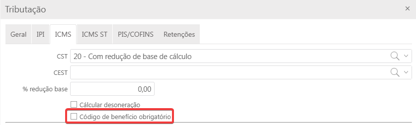 A caixa de seleção será exibida somente para os CSTs que requerem o Código de Benefício Fiscal e somente para empresas do regime "Normal".