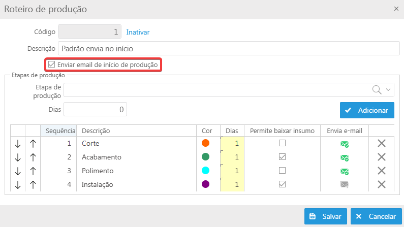 Para que seja feito o envio, é necessário marcar a check-box no roteiro de produção desejado, e o cadastro do cliente ter um e-mail válido: